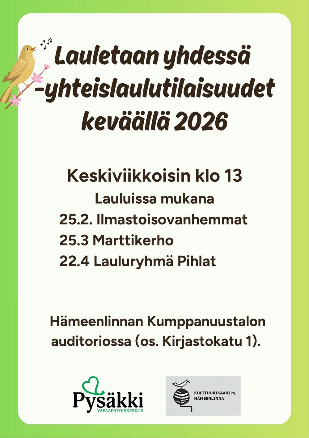Sitten löytyi ohjelmatoimintaa, joka sopii tällaiselle esiintymishaluiselle. Pysäkiltä löytyi moniste ”Kultaiset koululaulut vanhoilta ajoilta”. Kulttuurikaaren ohjelmistoon kuului yhteislaulua tämän monisteen laulujen merkeissä. Minulla oli hyviä muistoja laulamisesta koulussa ja seurakunnassa. Kitaralla pystyn hoitamaan helpompia säestyksiä tuttuihin lauluihin. Kulttuurikaari tarjosikin minulle mahdollisuuden palvella ohjelmatoiminnassa.